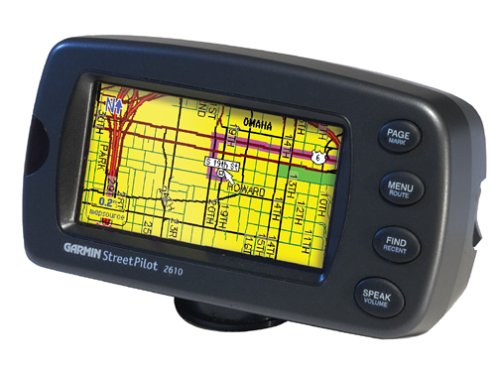 Never get lost again! The Garmin Automotive Navigation GPS will point you in the right direction every time by following the turn-by-turn commands and voice prompts. Select maps and transfer data directly to the unit through a USB connection and on to a standard CompactFlash memory card. Features a powerful microprocessor for fast redraw and route calculation; built-in patch antenna with an MCX-type connector for optional external GPS antenna; CompactFlash data card (type I or II) slot for map storage; audio and visual navigation instructions and warnings; 3-5/16Wx1-11/16H” (305×160 pixels) bright, automotive-grade 8-bit, 256-color LCD display with automatic dimming backlight and touch screen; and alphanumeric remote control. Includes 12/24V adapter cable and A/C power adapter. 3-3/16Hx5-19/32Wx2D”.Newly simplified for automotive applications, Garmin’s portable StreetPilot 2610 features both a touchscreen and an alphanumeric remote control so you’ll always have easy access to automatic route calculations, helpful turn-by-turn directions, and guiding voice prompts. The 2610 offers a color display, built-in maps, and everything you need to download additional map detail. It offers more precise location finding because of its WAAS technology, a feature the original StreetPilot and the StreetPilot III lacked.